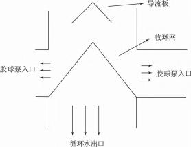 該廠通過(guò)提高收球網(wǎng)的位置來(lái)減少膠球在凝汽器循環(huán)水出水管中的活動(dòng)空間,同時(shí)設(shè)置一個(gè)膠球?qū)Я靼澹鐖D6所示,引導(dǎo)膠球進(jìn)入膠球泵入口位置。