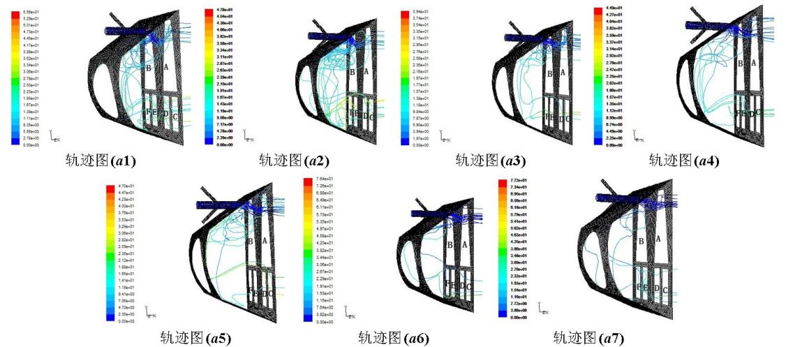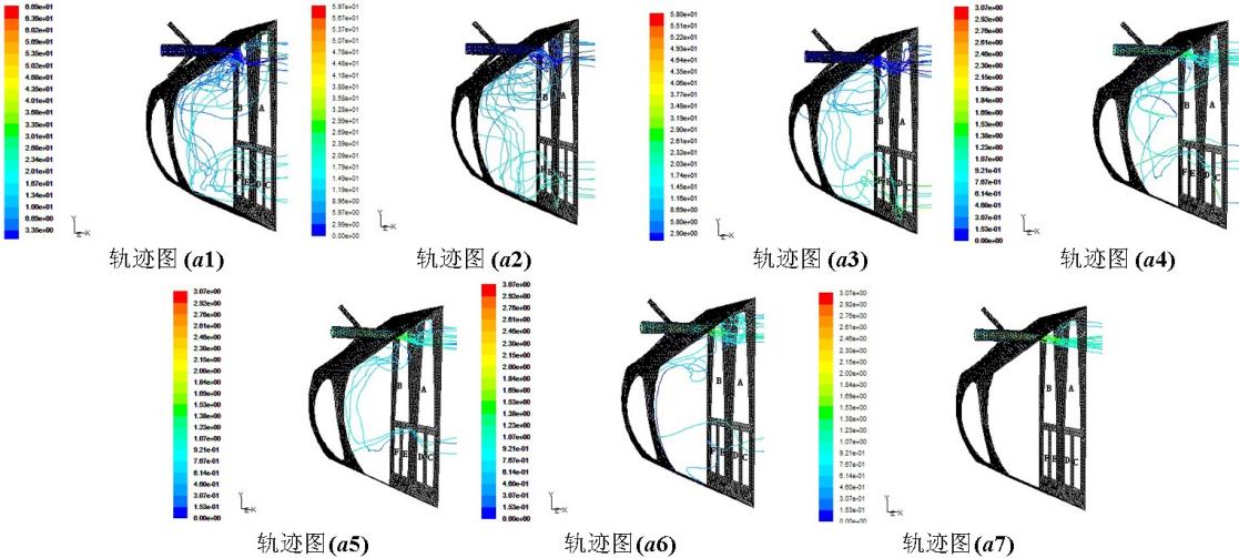 1m/s,a1表示射流速度U=1.3m/s、膠球速度V=1m/s。射流速度為1.3m/s時結(jié)果分析圖6表示對A區(qū)域上部分冷卻管束進行清洗,射流速度為1.3m/s時,送球速度分別為1.0m/s、1.2m/s、1.4m/s、1.6m/s、1.8m/s、2.0m/s、2.2m/s,進口水室內(nèi)的流線圖和膠球軌跡圖。對膠球通過A、B、C、D、E、F6個區(qū)域的情況進行統(tǒng)計,結(jié)果見表1。